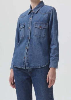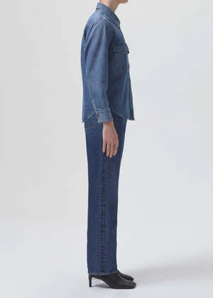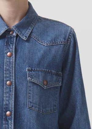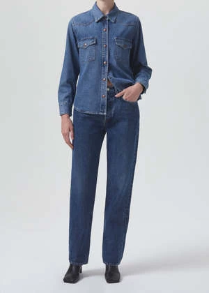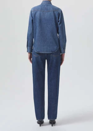 Washed medium indigo. Weightless, non-stretch recycled cotton blend with a soft hand to make an easy drape