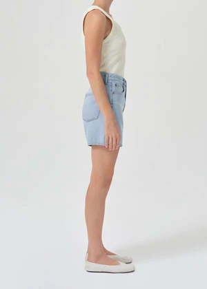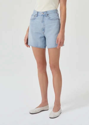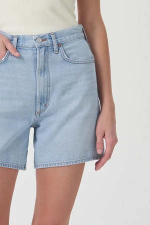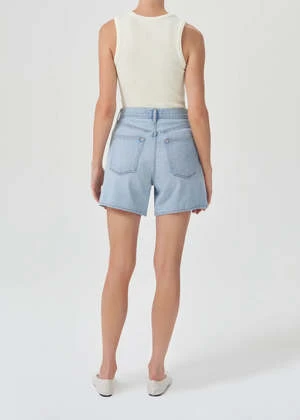 Agolde Stella denim shorts in light blue innovate wash, with slight fading and clean hem. Cut with a cinched, high waist and relaxed silhouette with room through the thigh. Designed with an angled hem for an ultra-flattering fit. Button fly.