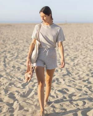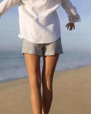 A yarn-dye stripe drawstring short made with sustainably-grown French linen and washed with biodegradable softeners. High-waisted with a 3″ inseam, curved hip, and a nice, big back pocket