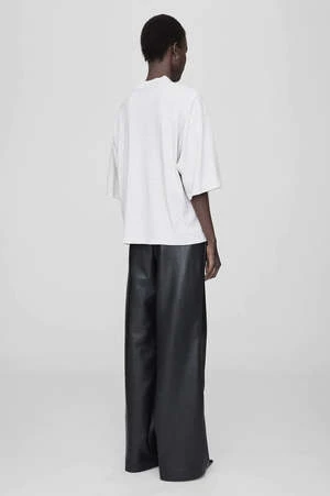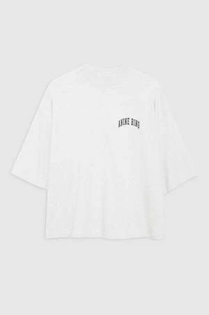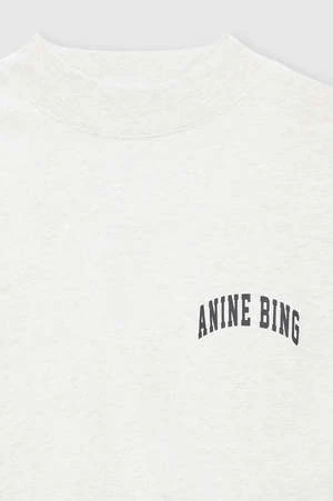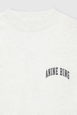 The Palmer Tee ANINE BING is an oversized T-shirt made from a soft-yet-structured heathered vintage jersey. It features a thick ribbed crew neckline, dropped shoulders extending into elbow-length sleeves, and a screen-printed ANINE BING graphic at the wearer’s left chest in authentic collegiate lettering.
