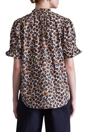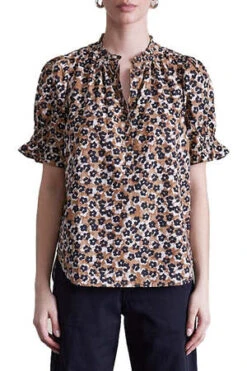 A staple silhouette, Apiece Apart’s Los Altos is back for the season in leopard bouquet. The design features a partial snap closure, puff-sleeve with elastic at cuff, banded collar with ruffle detail.