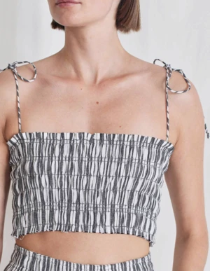 – Tube top, adjustable self tie straps, eastic smocking throughout