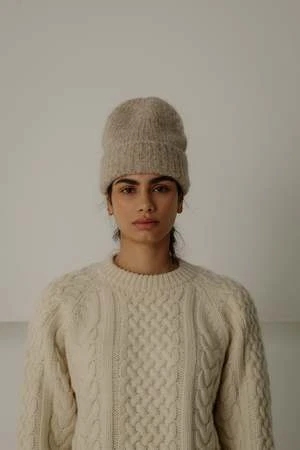 Seamless, chunky knit hat with a double thick cuff. Knit in un-dyed alpaca and Pima Cotton.
