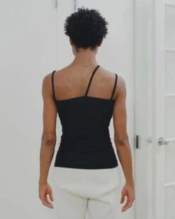 fine rib tank features thin shoulder straps and third asymmetrical third strap
