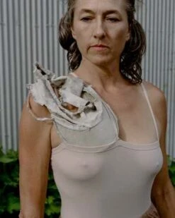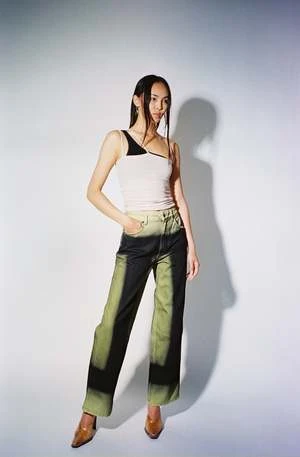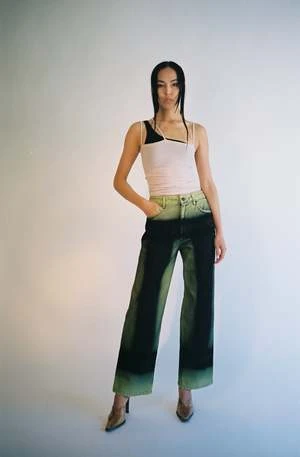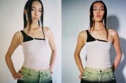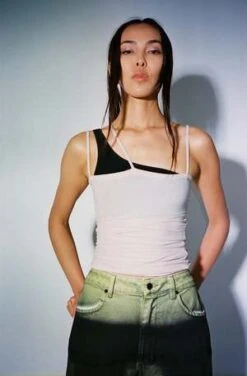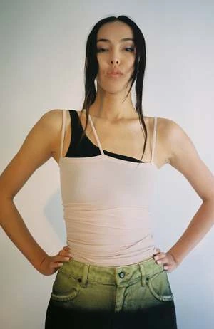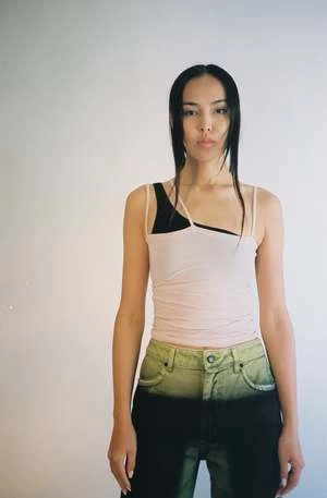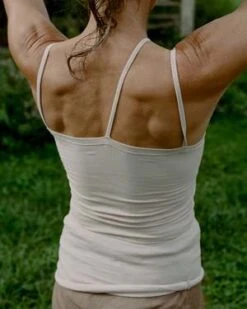 Nida tank in light pink color called Laut Pink. Ribbed cotton tank with 3 thin straps forming an asymmetrical neckline. Worn layered over the Una Bra.