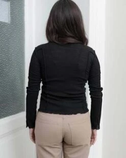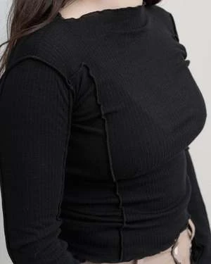 wool long sleeve top featuring boatneck, exposed seams and lettuce edge at neckline and hems