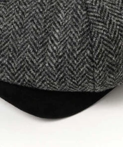 A newsboy cap featuring a combination of herringbone wool and pigskin. The different expressions due to the different materials and the classic features give a sense of playfulness for adults.
