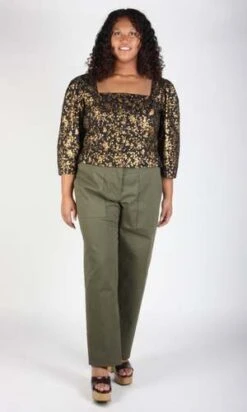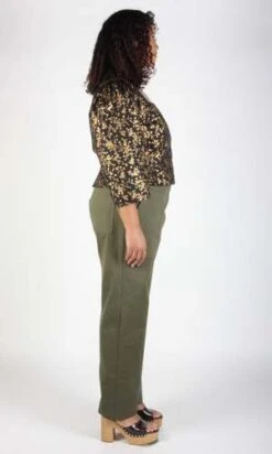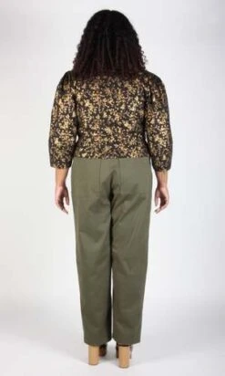 Our most opulent print of the season, this cotton has bright gold highlights that catch the light beautifully on a black background. This colourway features Italian metal buttons to compliment the metallic print.