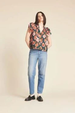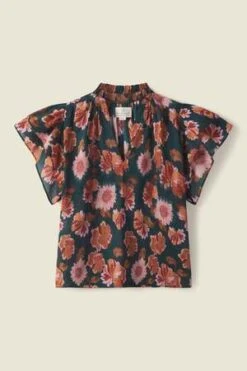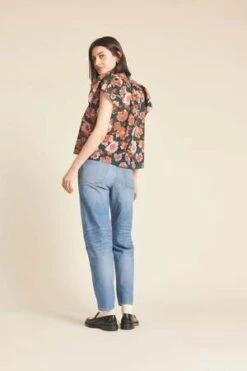 The Clover blouse is the perfect combination of vintage-inspired style and modern femininity. The blouse features a deep V-neck front and boasts wide ruffle sleeves with delicate trim details along the hemlines, reminiscent of the Carla highneck shirt. It can be worn tucked in for a more tailored look or left out for a casual feel. Made from soft cotton.