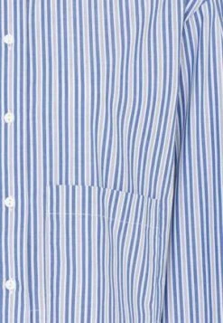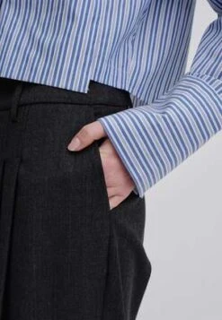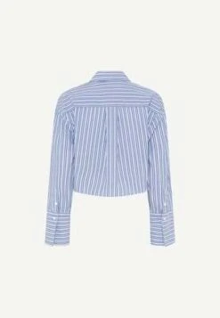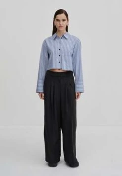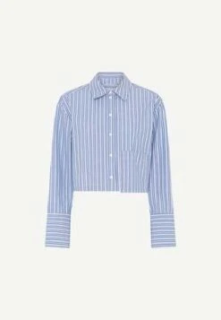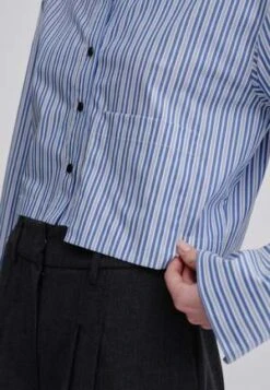 Cropped shirt with long sleeves with long cuffs, featuring a box pleat in the back. It has one pocket that extends past the bottom hem. The shirt is designed with a button closure.