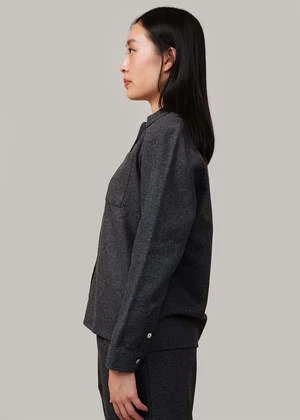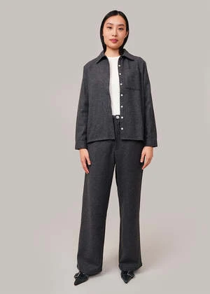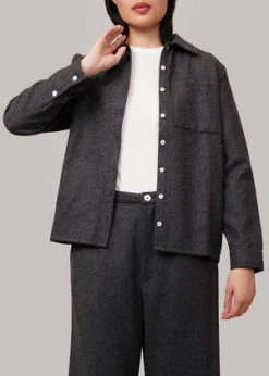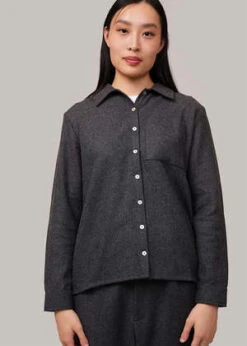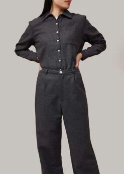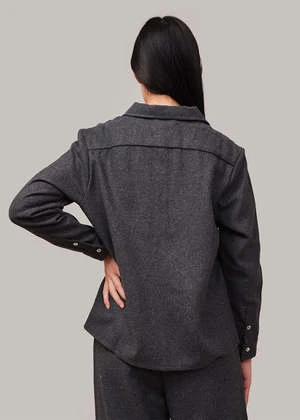 Dark grey melange classic button-down overshirt made from a heavy wool-blend fabric. Features mother of pearl buttons down the front. Can be worn layered and open or closed on its own. Matches with By Signe’s Liv Flannel Trousers.
