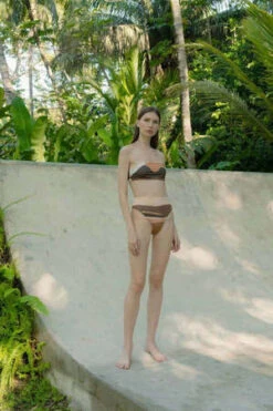 Lulu Bikini Bottom in Terra is a high-waisted style with a high cut and an abstract print.