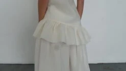Caron Callahan Rosemond Camisole in Ivory. Lightweight tunic in double ivory cotton and silk with asymmetric ruffle at hem. Cap sleeve, bateau neckline, bottom ruffle, raw edges at hemline. Pull on. Double Layered.