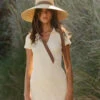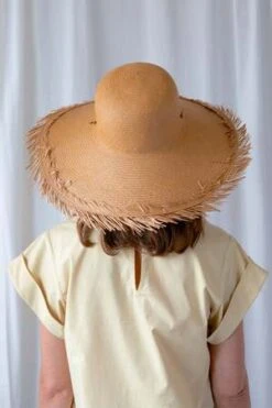 Round top vented hat with fringe in fine toquilla straw. Features ties.