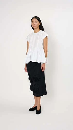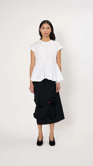 The Peplum Blouse has a relaxed silhouette made of a cotton poplin. It features a rounded neckline, short sleeves, a ruffled peplum waist, a concealed back zip, and raw, asymmetrical hem.