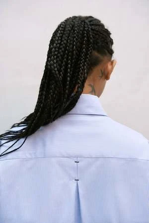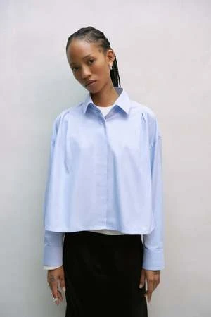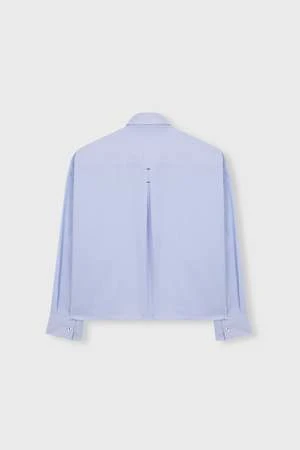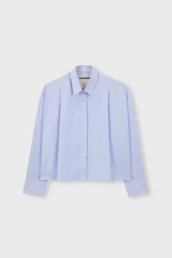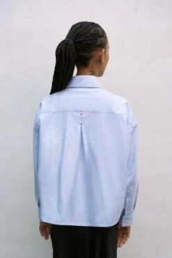 A timeless shirt with a classic blue color and modern design, it’s ideal for everyday wear. Details include super fine sripe print, oversized fit, long sleeves, button fastenings, pointed collar and one button fastening on the cuffs.