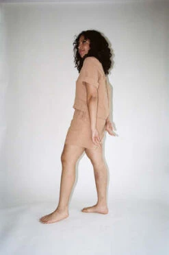 The comfortable elastic waist shorts made of 100% OEKO TEX certified linen. It has side pockets. It is light and simple, the perfect basic to wear this summer. It can be worn with a loose, cropped top for a casual everyday look.