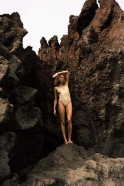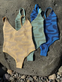 One piece swim suit with v-neck, fixed straps and cheeky coverage in the back. 3D seamless knit design with custom two color wave knit pattern. Designed in Hawaii. Made in Brooklyn, N.Y. Learn more about our Brand and product here.