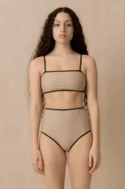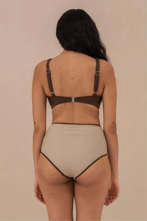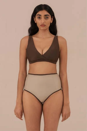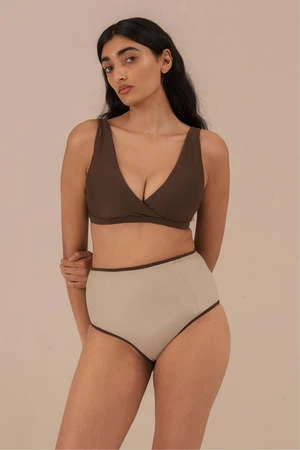 A flattering high waist bottom with front panels and a moderate coverage behind that will contour your shape. Mix and match to find the colour pallet that suits you.