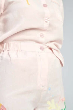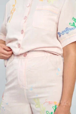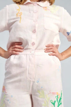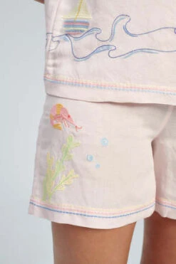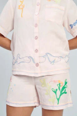 Loose fit shorts with buttons closing in the front and an elastic waist and two patch pockets in the back. The shorts are decorated with an embroidered underwater world of wild seaweed, shrimps, bubbles and a splashy Helmstedt H.