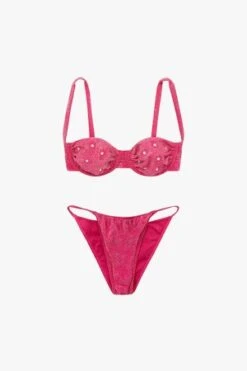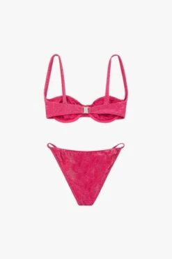 All you need for a day of lounging at the beach. The top is crafted in an under-wire cup and embellished diamante detailing with stretch lurex fabric. The matching bottom is a high hip fit that elongates the legs. This bikini is lined with recycled poly and is made and designed to wear in water. Also available in color Topaz.