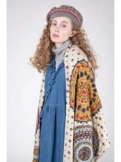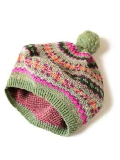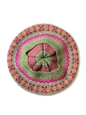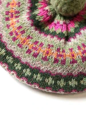 A knit beret with an eye-catching bright fair isle pattern. A knit beret that changes its expression depending on how you wear it.