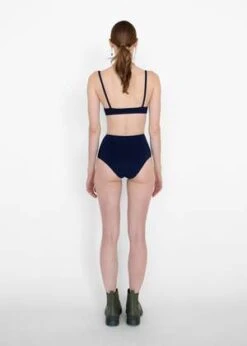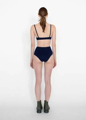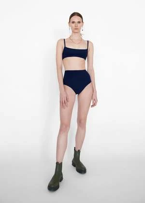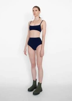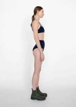 a two-piece with a pull on top, brought to us this season in a rich navy. The top features a straight neckline and is a pull-on style. It is paired with flattering high-waist briefs. Undici’s flattering design creates a timeless and luxurious look that will take you from beach to bar with effortless elegance.
