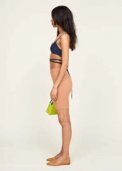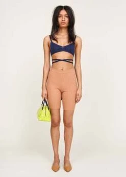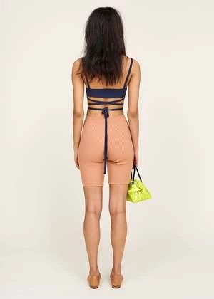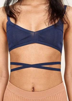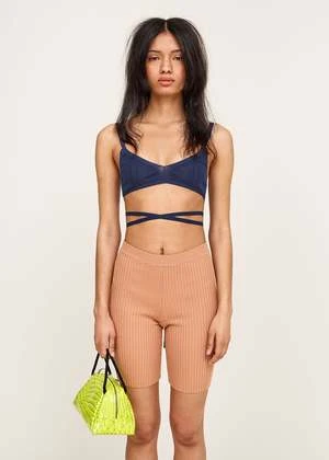 Ribbed bra top from MARYAM NASSIR ZADEH in lake blue jersey. Thin straps, open neckline. Elasticized underband widens at the back. Long wrap-around tie detail.