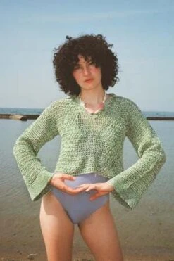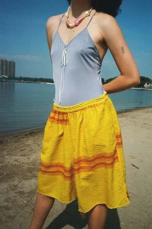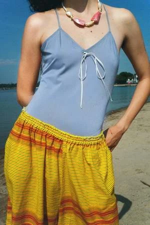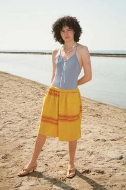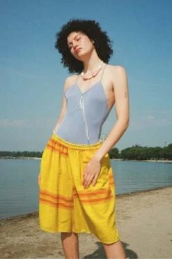 Gillian is 5’8 and wears with the Overdyed Stripe Beach Short in Cyber and Zig Zag Polo in Green.