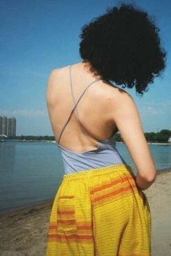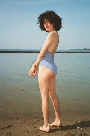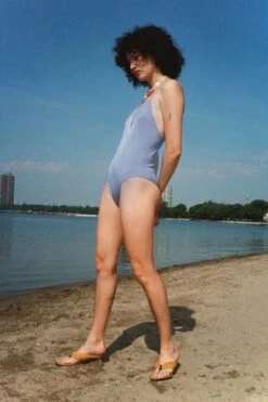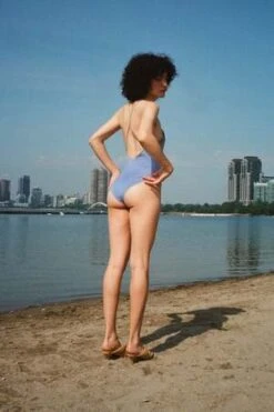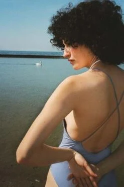 Spaghetti strap bodysuit in light lapis blue. The Storm One Piece is fitted in silhouette with lots of stretch for comfort throughout your wear, and straps criss crossing in the back holding everything in place. Features a v-neck shape down the chest, complimented by two grommets with a removable off white string fastened through into a bow for an added detail.