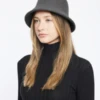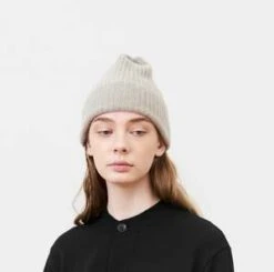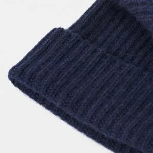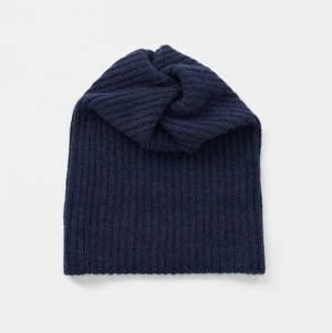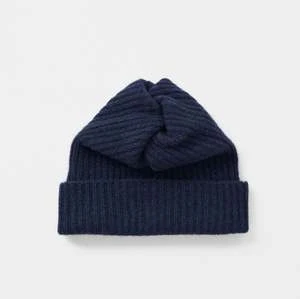 Finest knit cap with pleat at crown. Ribbed design in heathered indigo blue.