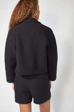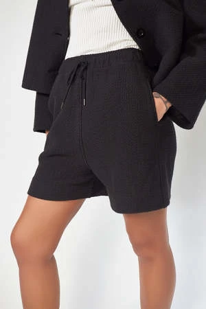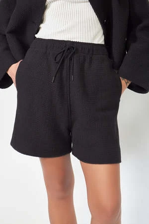 These black high waisted knittede cotton shorts from Missing You Already free your legs and gives you for sure joy to wear due to its comfortable relaxed fit that has handy side pockets. Featuring an elasticated drawstring waist. Wear it on the beach with your favourite bikini or during the day with a loose cotton shirt.