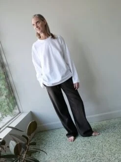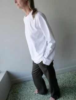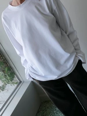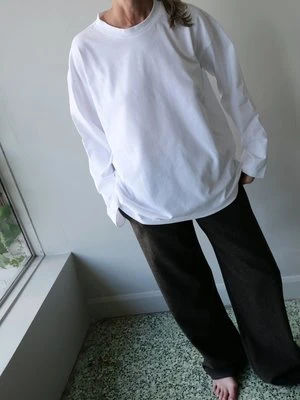 MONIQUE VAN HEIST 1982 TOP IN WHITE. RELAXED FIT LONG SLEEVE SWEATER IN A COTTON WHITE JERSEY. FEATURES A ROUND NECK, DROPPED SHOULDERS AND EXAGGERATED LONG SLEEVES. MEASURES APPROXIMATELY 29 INCHES IN LENGTH.