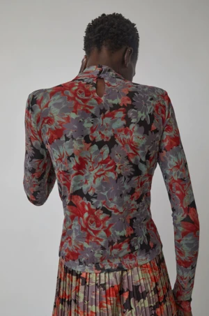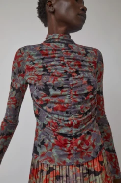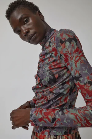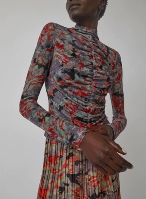 This long sleeve fitted mesh turtleneck features a flattering ruched center seam. With a hem long enough to tuck and form-fitting silhouette, the Kara Top will easily become a statement piece in your rotation for seasons to come.