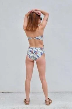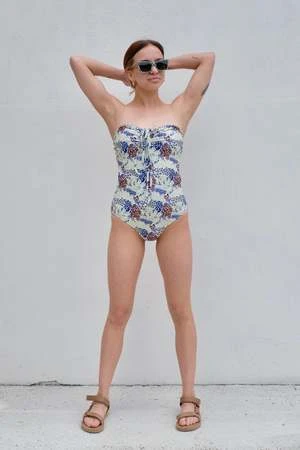 Floral printed one piece monokini. Designed with adjustable halter tie strap, front ruching, and cutout back. Moderate coverage. Fully lined. Also makes a great bodysuit.