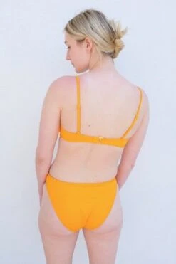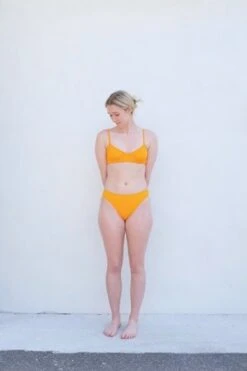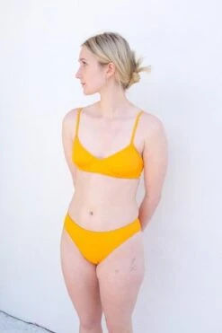 A simple bottom cut high on the hips and the back, but mid-rise at front about 2 inches below the navel. Finished with 1/4 inch binding at the waist and leg openings.