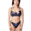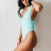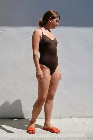 A cross-back one piece with 3/8″ binding and straps and a mid-cut leg for medium coverage.
