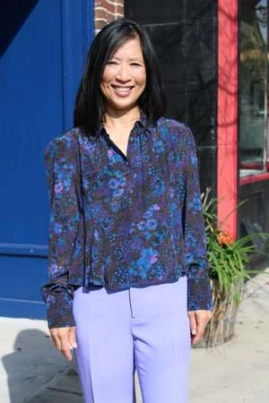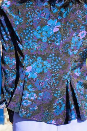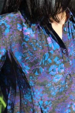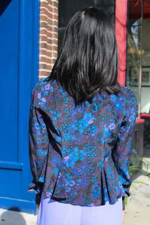 Button up half placket top with a peter pan collar and subtly flared waist, in Rachel Comey’s new 70s-inspired graphic floral print silk.