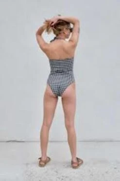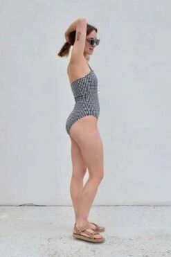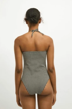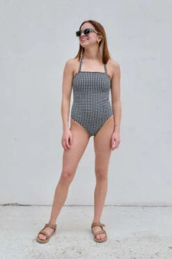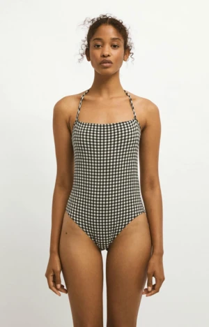 Straight neckline swimsuit, spaghetti straps.