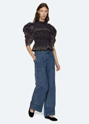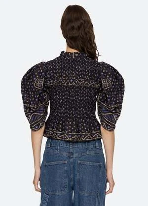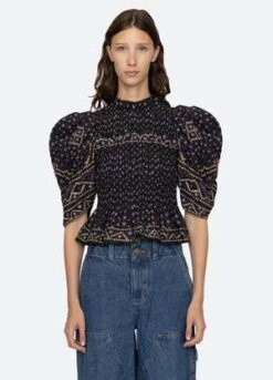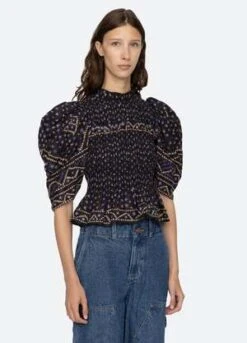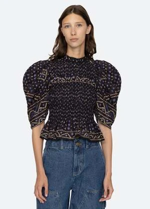 The Delphine pucker cotton top features puff sleeves, smocked bodice and ruffle trim detailing.