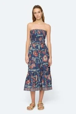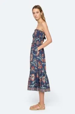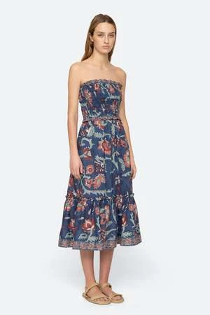 The Luna floral print strapless swim coverup features a smocked bodice that secures at the back with ties.