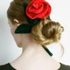 Beaded hairband decorated with beautiful black glass beaded flowers and smooth faux pearls in mimosa yellow. Silver tone metal base.