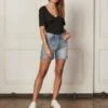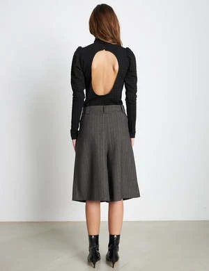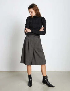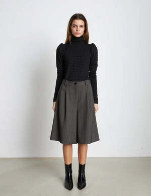 Bermuda shorts with pinstripes from Copenhagen’s Stella Nova. Button closure. The shorts have belt loops if you desire a bit more definition with a belt. Loose fit and a cool knee-length. Style alone or with the cool matching oversized blazer.