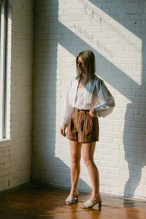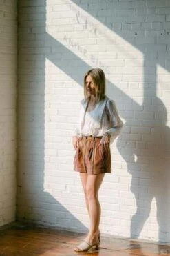 This short by Apiece Apart features a high waist, slight a-line silhouette, and self belt loop.