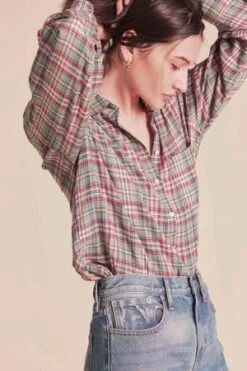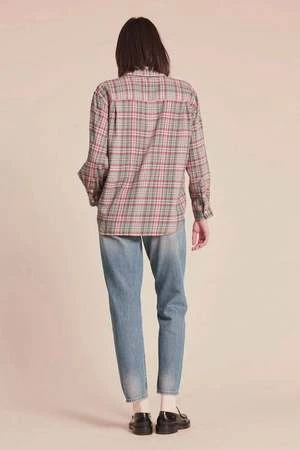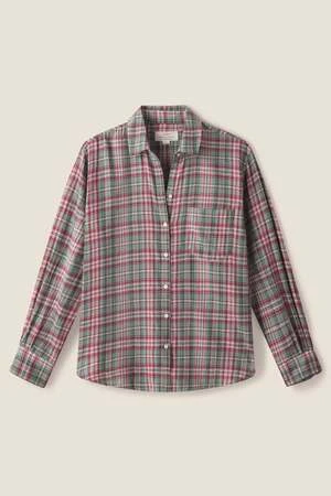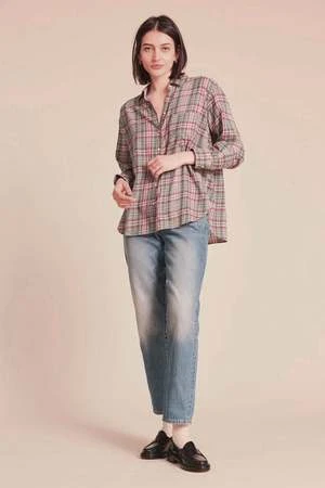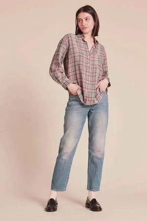 Trovata Blake Oversized Shirt in Fairmont Plaid. Boyfriend style button-down. Small notch collar front placket with antique white buttons and a single chest pocket. Straight hem and overall relaxed fit. Made from soft cotton. 100% cotton