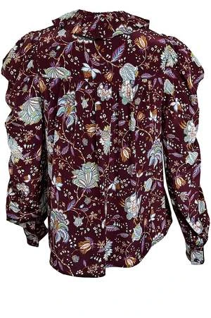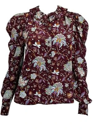 This blouse by Ulla Johnson features a puff sleeve, ruffle neckline, and button front.