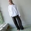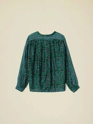 Arden is made in a woodblock medallion printed cotton silk twill for an elevated feel. This popover top is lined in the back and features self-covered buttons, drop shoulder with folded seam details, placed border printed back yoke, and slight high low hem.