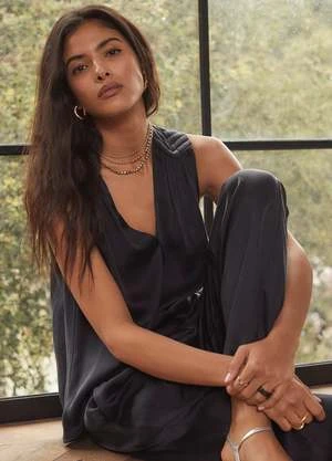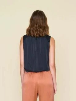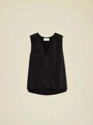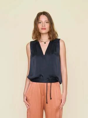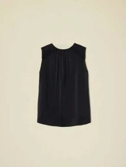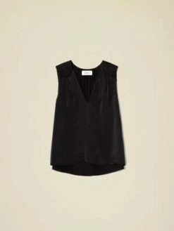 Hidden gems. Made in soft, luxe silk charmeause, Vivi is a sleeveless popover top with a deep V-neck, shirred quilted epilates at the shoulder, and high low hem.