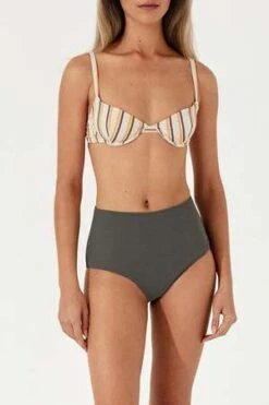 The Licorice Stripe Rib Balconette Bra Cup by Zulu & Zephyr features a soft bust with underwire and thin adjustable straps, offering versatility and gentle support.